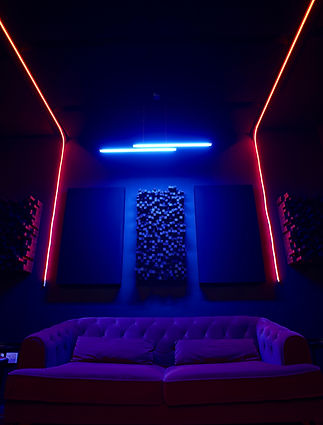 The space features full acoustic treatment, a floating floor, fully soundproofed walls and ceiling for maximum isolation and clarity.